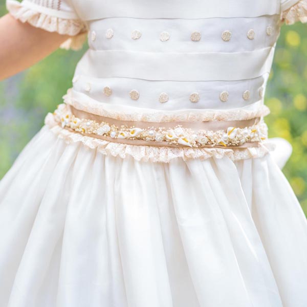 Cinta para cintura de flores y calas. Con un diseño clásico y delicado la cinta de flores para bodas y eventos con aires románticos y elaborado a mano, hacemos un tapiz de flor paniculata preservada y brisa máxima color cava con pequeñas calitas.
