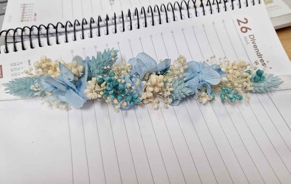 - Productos: Composición de flores secas y preservadas como la hortensia, Phalaris, paniculata, galceran, avena, delfilium, limulium y flor natural preservada.