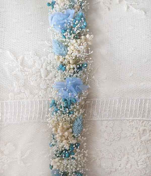 Un conjunto perfecto es el adorno para la cintura a conjunto con el ramo. Los complementos de flores secas y preservadas para la boda, deberían ser siguiendo estos colores.