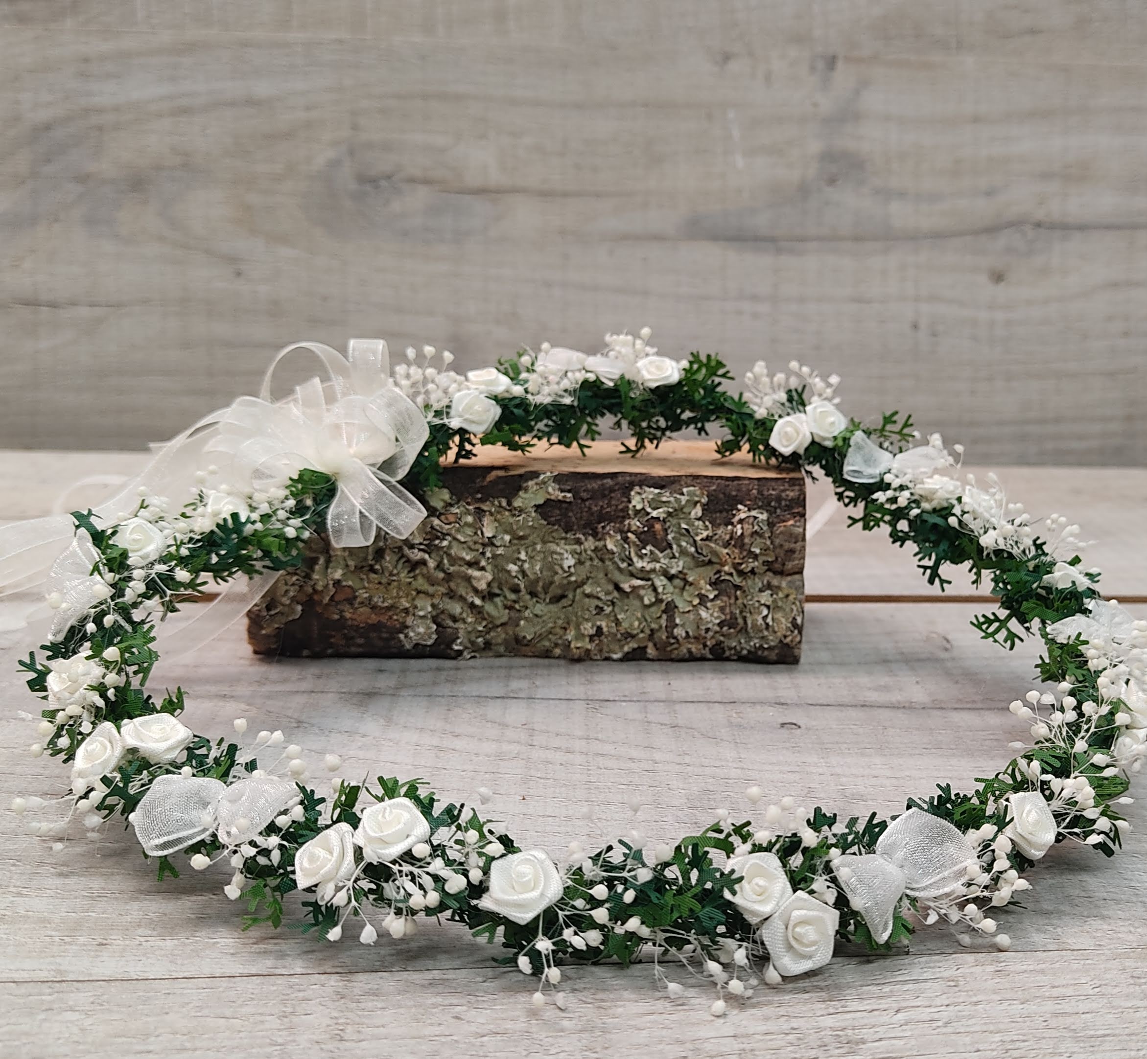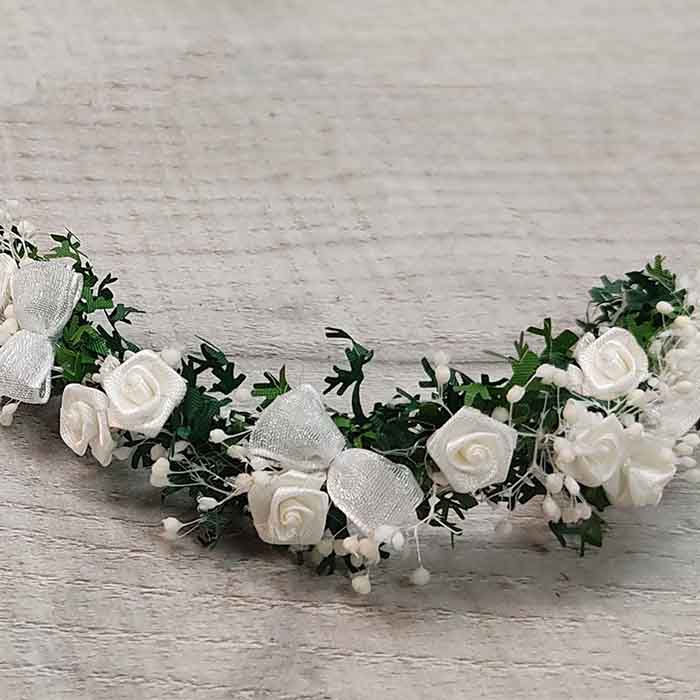 Corona con Rosas Blancas. Colores neutros de esta diadema con rosas de color blanco roto que te aportan luz sobre la base verde y la paniculata blanca. Si prefieres darle más color, puedes escoger, ya que disponemos de una gran variedad de colores para el peinado de tu niña.