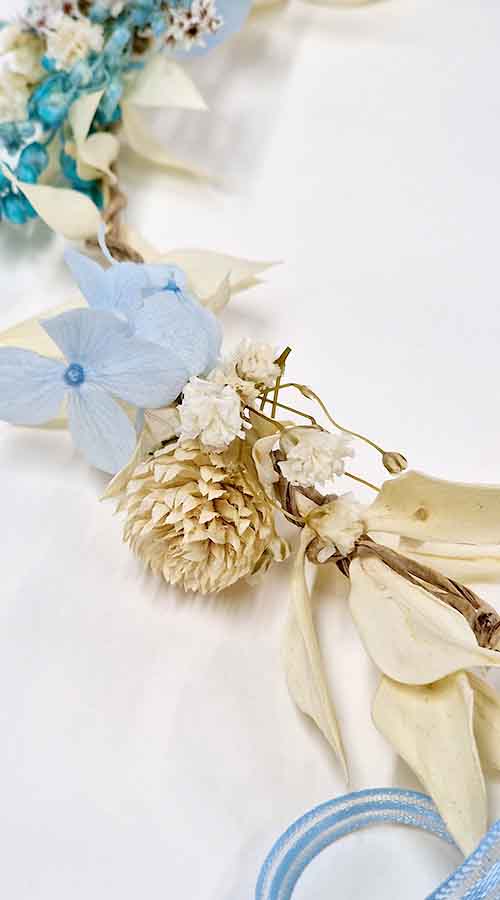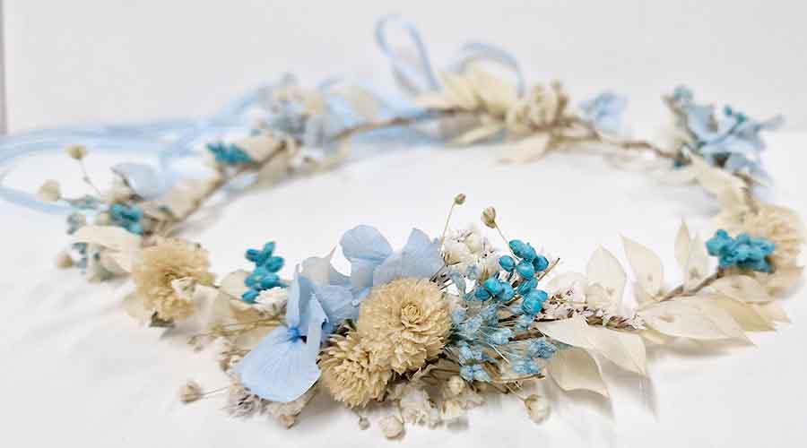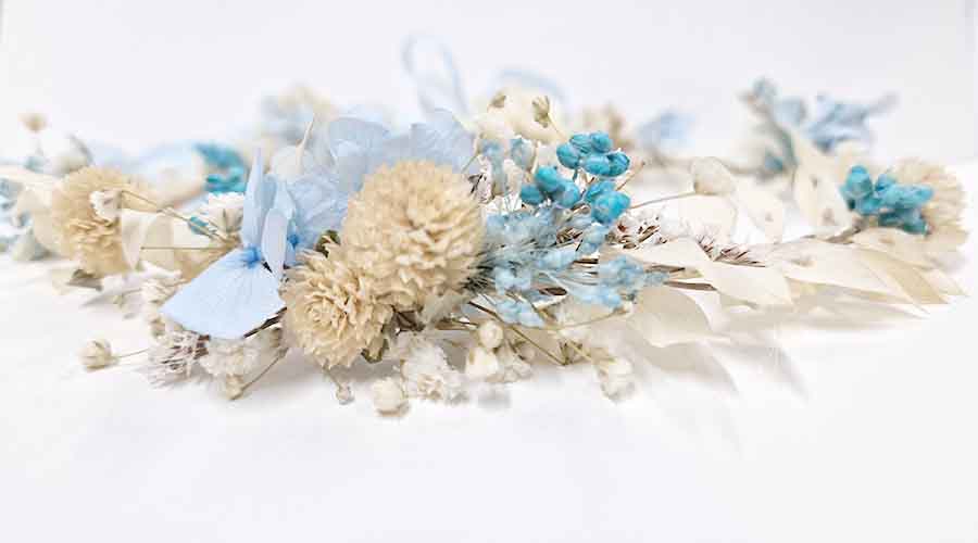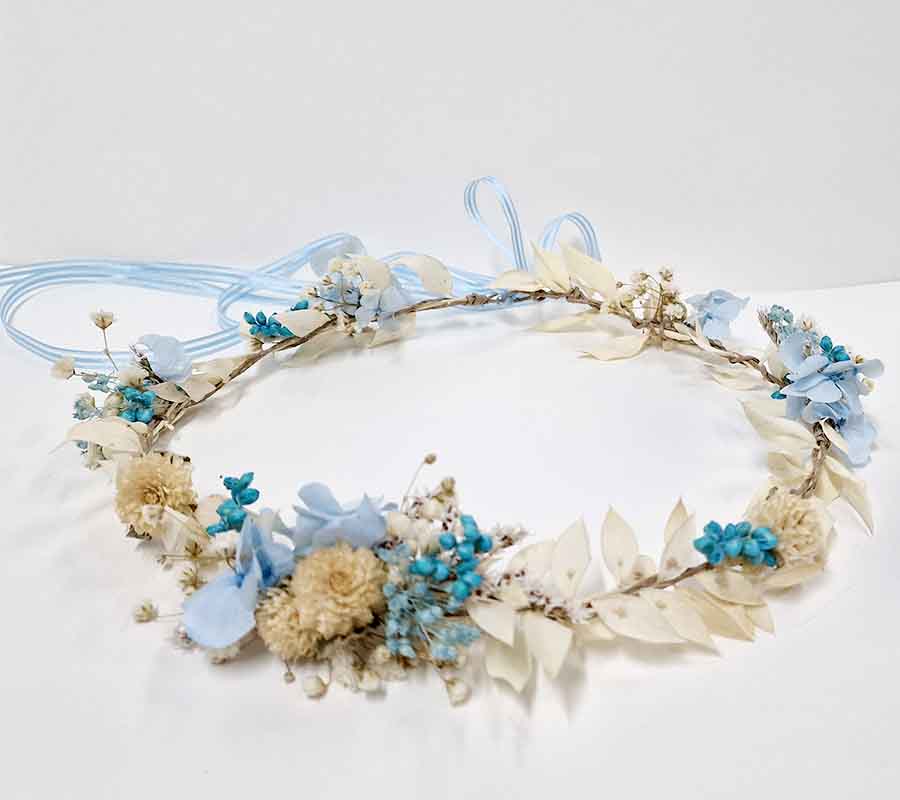 Gama de colores neutros, blanco, cava, natural, azules de diferentes intensidades. Flores preservadas, la hortensia, paniculata, galceran, gomphrena globoso color celeste, flores preservadas, hecha a mano en el taller de Abril Dissenys. Realizada con nuestro sistema del trenzado de flores, lo que nos asegura  que podrás lucirla tantas veces como quieras, dando siempre un toque especial a tu peinado, aportando un aire romántico vintage o boho chic.