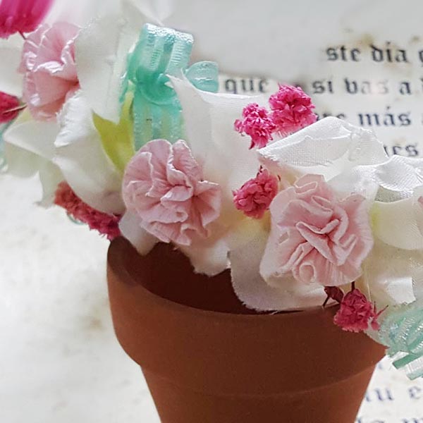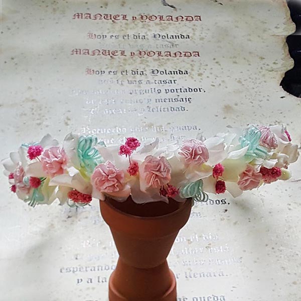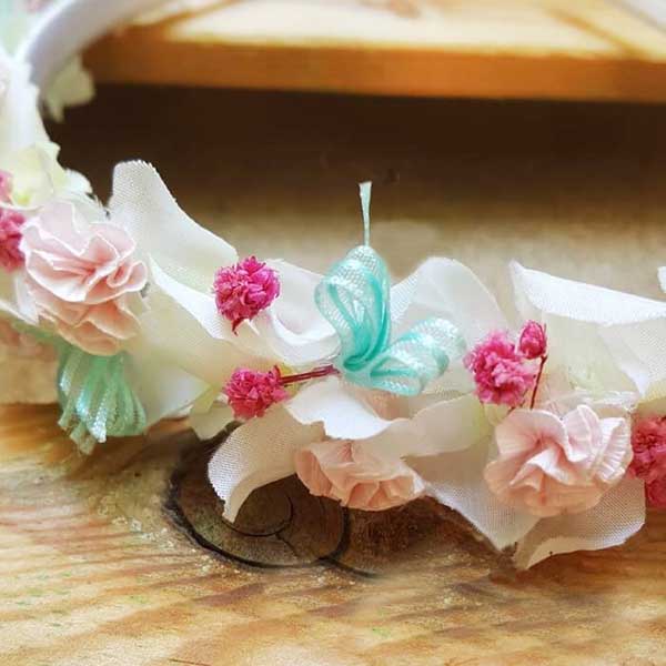 Con la base de flor de paniculata, combinadas con rositas y claveles de papel, pétalos de hortensia de tela, madroños de gypsophila preservada de color y claveles de color fucsia. La Diadema de Claveles y Flor Preservadas