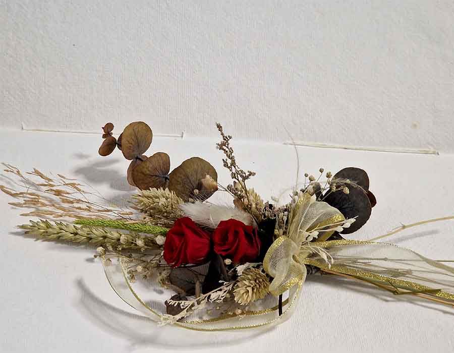 - Elaborado con: Hemos utilizado 2 rosas, trigo, gripsofila, la brisa del aire, poa, pleum, bloom y eucaliptos.