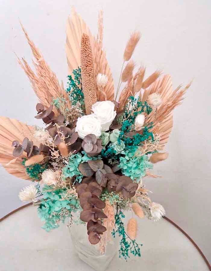flores naturales, secas y preservadas de alta calidad. Su diseño elegante y romántico incluye