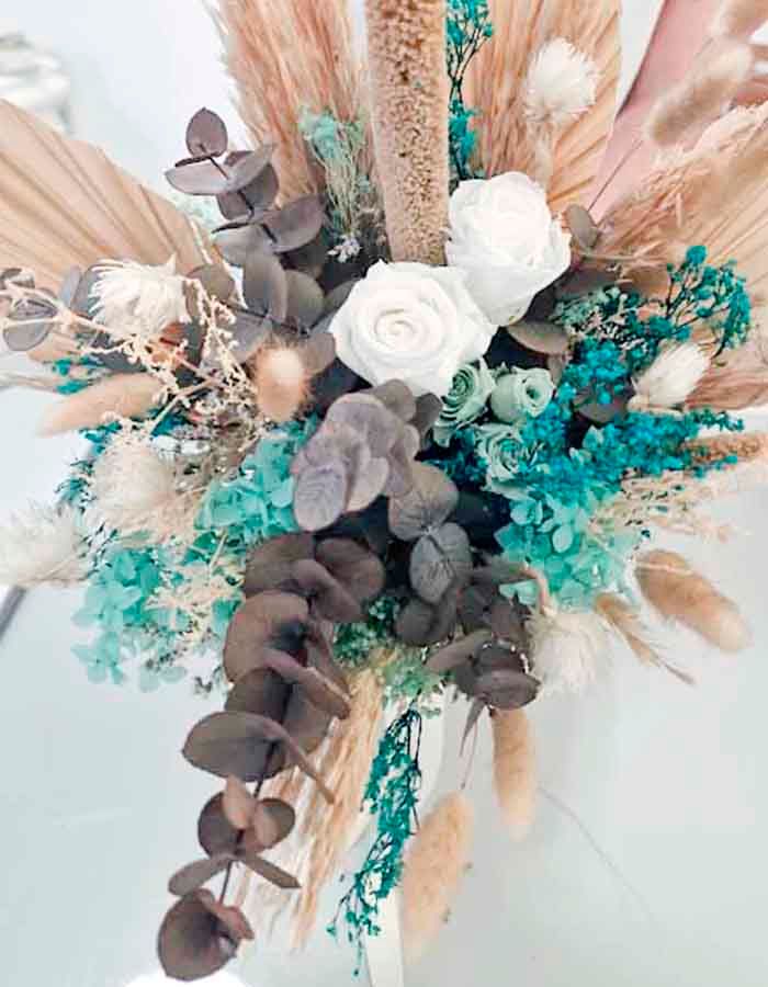 flores frescas, secas, liofilizadas y preservadas, creando complementos perfectos para bodas y eventos. Su diseño único permite que el ramo no solo acompañe a la novia en su gran día, sino que se conserve impecable con el paso del tiempo.