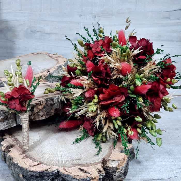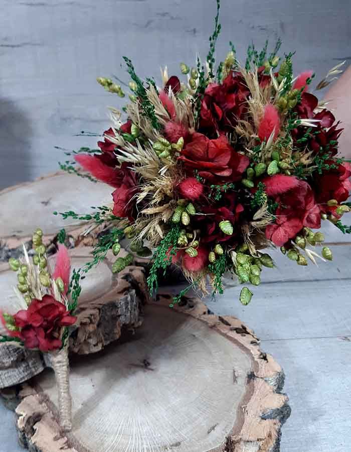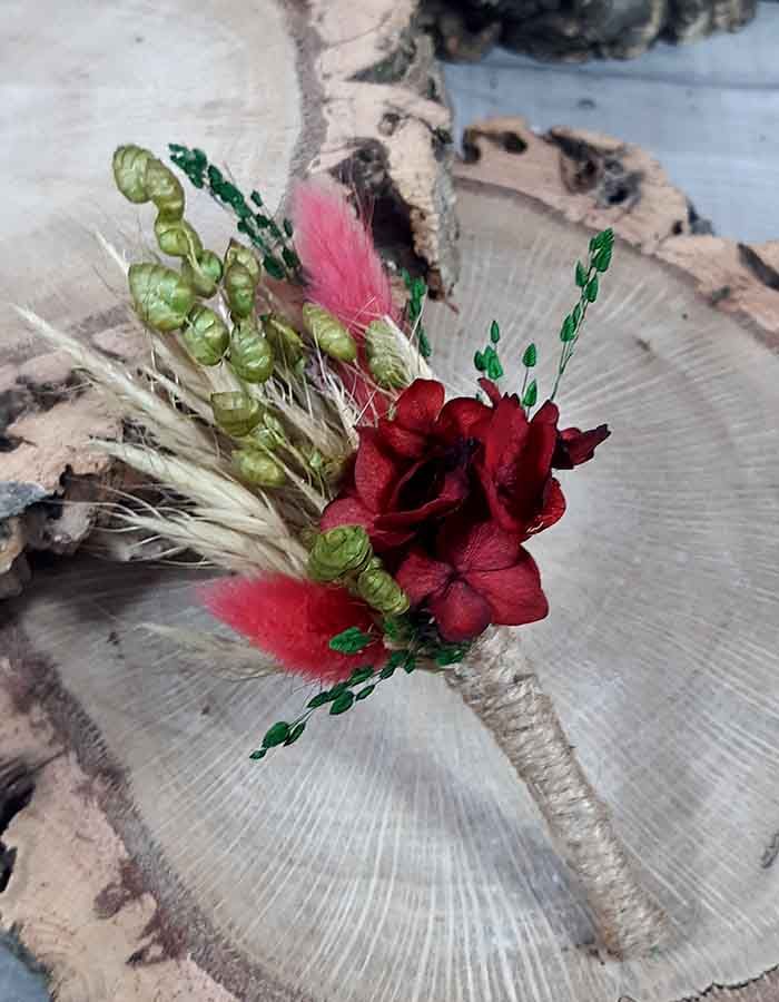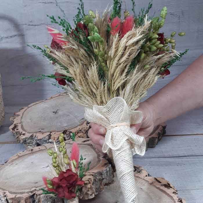 - Ornamentación: Flores secas y preservadas. Hortensia, paniculada, Bloom en tres colores, avena, brisa máxima, pleum, lino