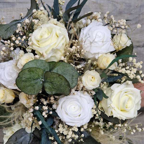 El color principal es la luz, la luz que desprende este ramo con quince rosas en diferentes tonos de blanco, con hortensia, rosas en dos tonos y en dos tamaños, el color secundario es el verde que aporta elegancia y naturalidad a ramo, el verde del eucaliptus que no puede faltar en este precioso. Gipsófila preservada, galceran blanco preservado, hortensia preservada, avena y tacida preservada.