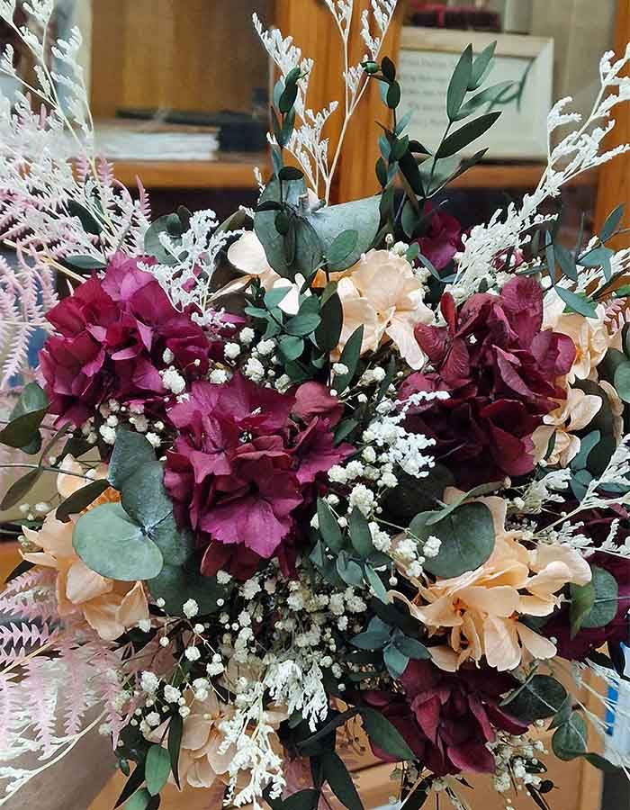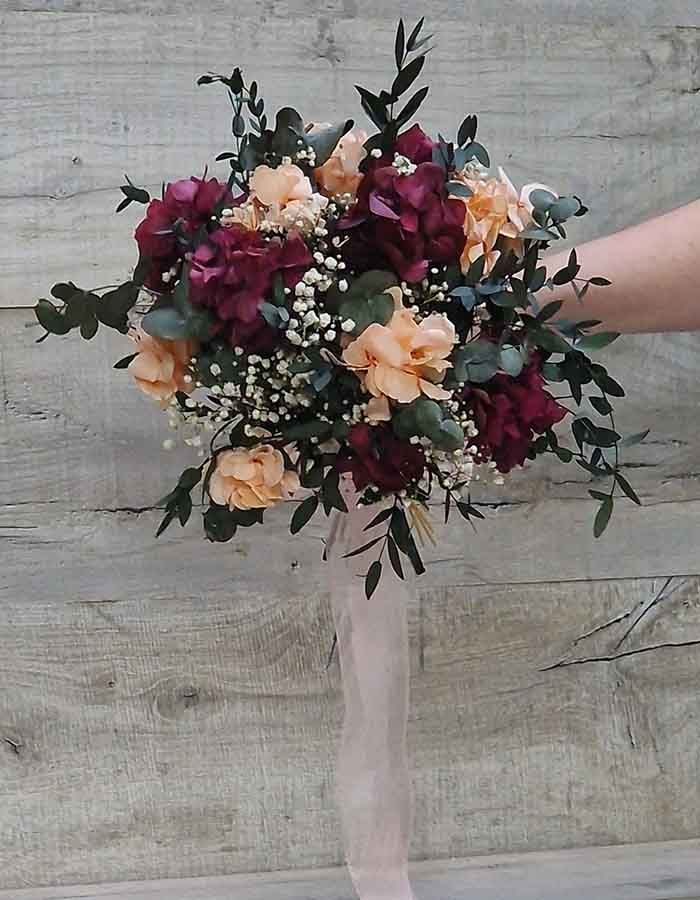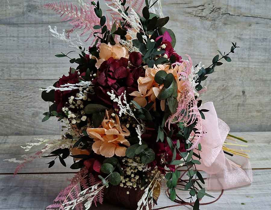 ramo espléndido hecho para que lo luzcan las novias más atrevidas con flores naturales, secas y preservadas, como la hortensia en tonos salmón y burdeos; los verdes en diferentes escalas le aportan frescura y naturalidad, y terminando con los neutros como el blanco y cava, que destacan por su elegancia y sofisticación.