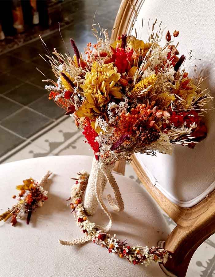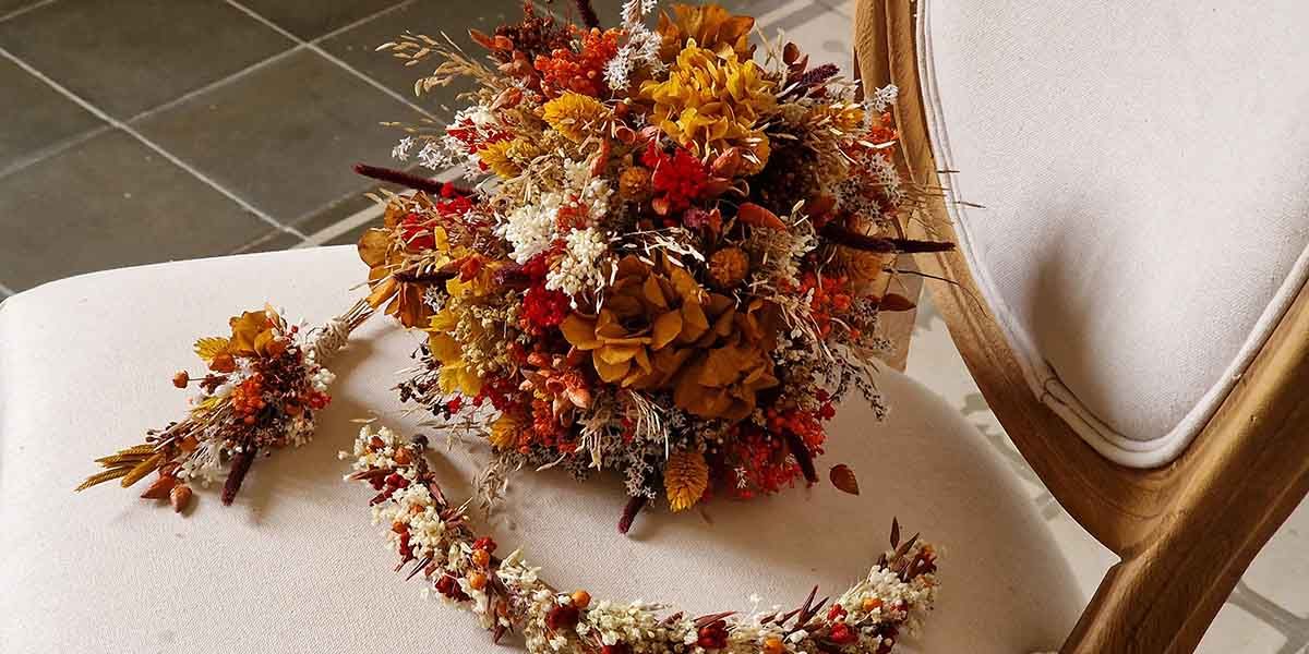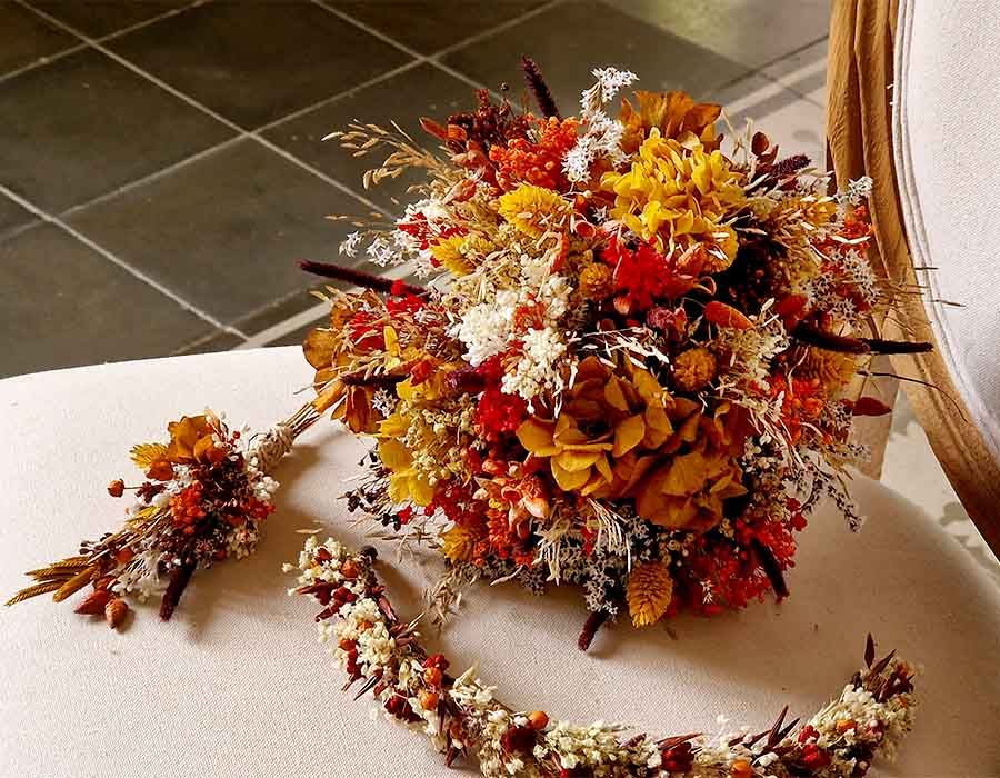 variedad de flores, realizado con flores naturales secas y preservadas como la hortensia en ocre y marrón, brisa de aire, blome en tonos marrones y naranjas, tatarica, poa en tonos mostaza, brisa máxima...