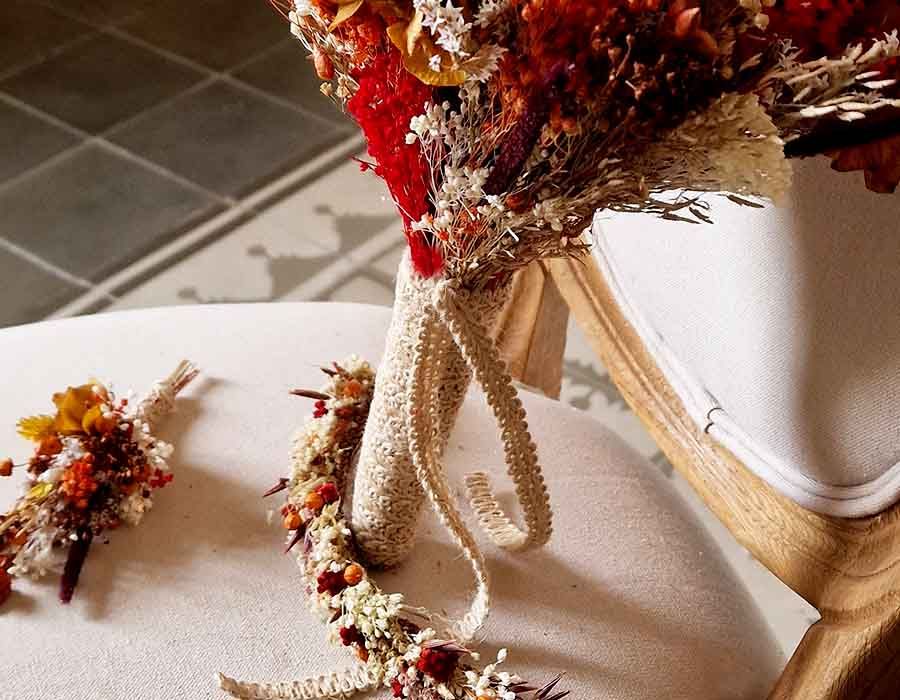 - Ornamentación: Flores secas y preservadas. Hortensia, paniculata, Blome en tres colores, avena, brisa máxima, pleum, lino.