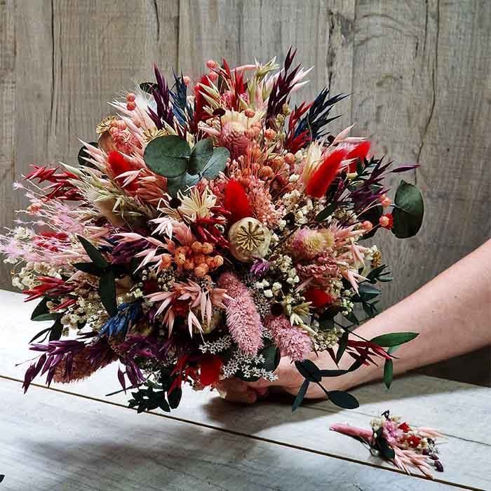 Un exuberante y multicolor ramo de flores tamaño más vendido, creado para la novia en el día de su boda; eso sí, escoge bien tu tamaño; recomendamos que lo elijas según tu estatura. O simplemente porque te encantan las flores preservadas. Un ramo para la noviacon flores naturales secas y preservadas, flores silvestres vivas y llenas de luz. Con el tallo semiforrado con cinta, los tallos de las flores semidescubiertos, manteniendo así su naturalidad. Otra de las ventajas es la posterior utilizacióndecorativaen el mejor rincón de tu hogar toda la vida.