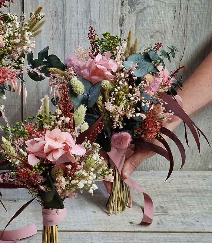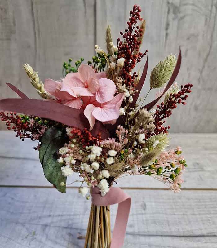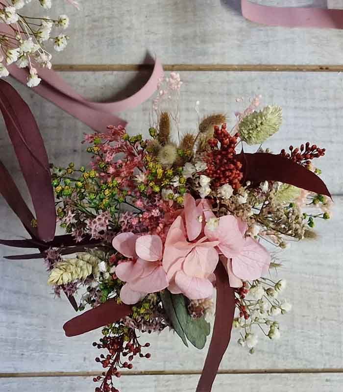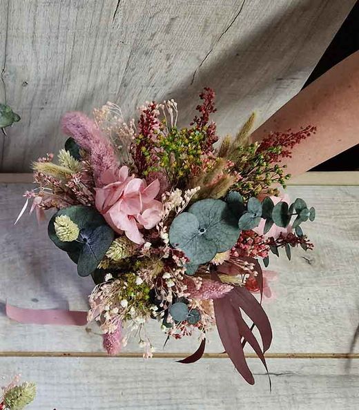 - Flores utilizadas. Bloom, cava y pistacho, paniculada, fucsia, miscanthus rosa, poa natural y verde, eucaliptus, baby, craspedia, avena rosa nude, hortensia rosa, setaria y solidago burdeos.