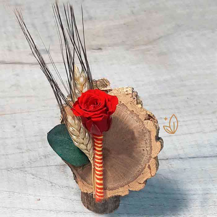 Rosas y espigas de Sant Jordi. Comprar una rosa el día más especial y que puedas tenerla muchos años de recuerdo y que siempre estará contigo, apoyada sobre una rodaja de madera, el ramillete con la rosa y las espigas de trigo que la acompañan en este día de