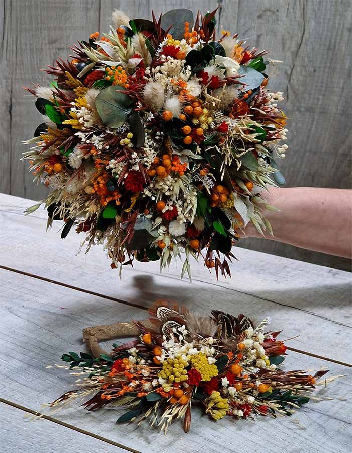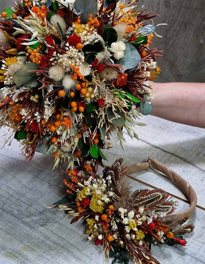 Set Floral Novia Otoñal.Ramo tocado y solapa otoño Un exuberante y multicolor ramo de flores, creado para la novia en el día de su boda, eso sí, escoge bien tu tamaño, recomendamos que lo elijas según tu estatura. O simplemente porque te encantan las flores preservadas.
