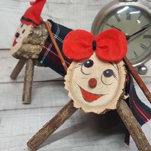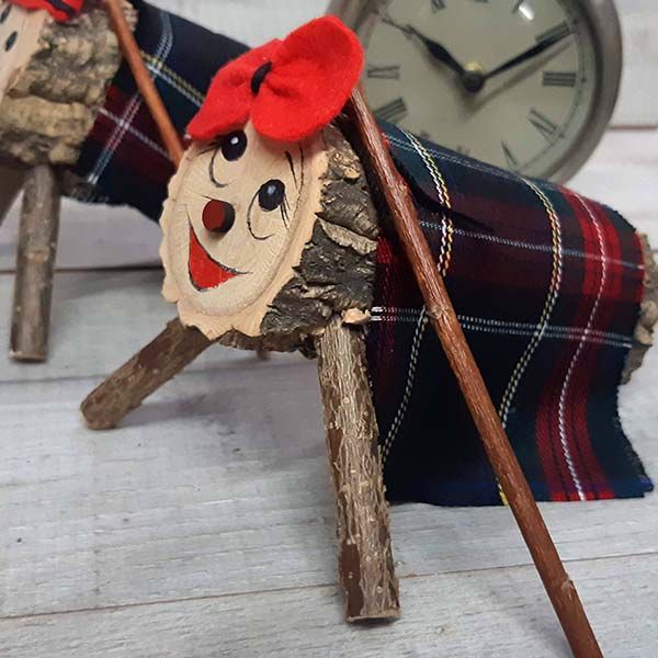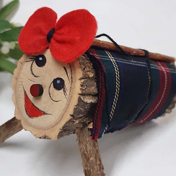 Tiona de Navidad Pequeña Ellen. Con todos los complementos necesarios, lazo rojo y negro típico catalan, manta de cuadros escoceses, palo a tamaño de la tiona.