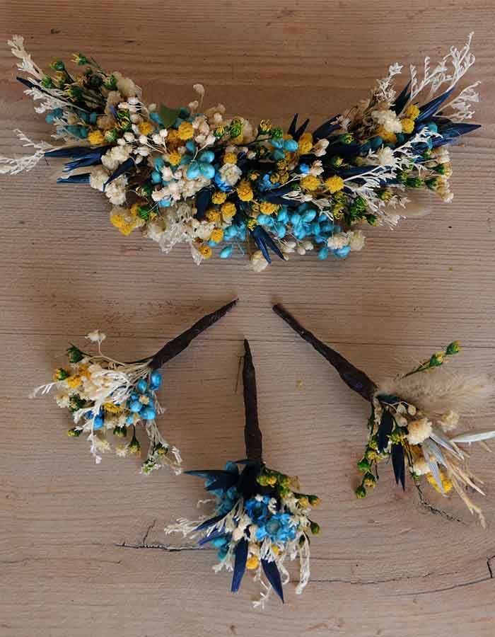 Los colores azules podemos combinarlos con los colores de tu vestido y hacerlo totalmente personalizado, siempre trabajado con flores del campo naturales, tocado silvestre y perfecto. Si lo deseas podrás lucirlo a conjunto con tu ramo de novia