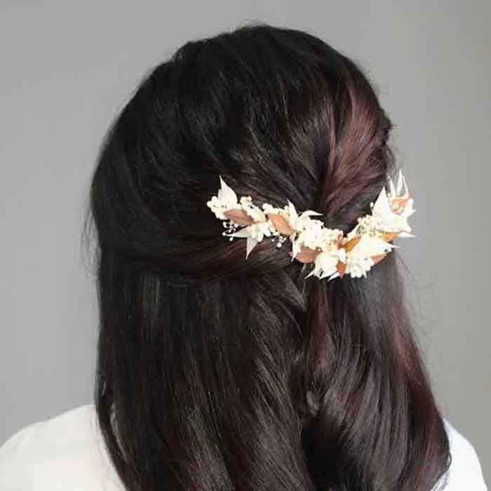 - Colores Blanco, marrón, aunque, se puede personalizar en el color que más te guste. Los adornos para el cabello de este año son de flores preservadas, con un énfasis en los colores neutros,