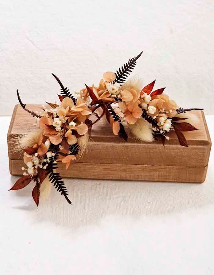 En tonos cálidos y otoñales, un adorno de flores que va más allá de lo convencional. Este accesorio no es solo un complemento para el cabello, es una declaración de estilo y elegancia, pensado especialmente para esas celebraciones en las que cada detalle importa.Diseñado con flores preservadas, el Tocado de Flores Afrodita aporta una sensación única, como si flotara en tu cabello, abrazándolo con una forma curva o recto que se adapta perfectamente a peinados para 2025 en recogidos, coletas, trenzas o moños deslumbrantes.Este accesorio se convierte en una joya indispensable para bodas, comuniones o eventos sociales, hecho para destacar y celebrar la belleza natural de cada mujer. Porque