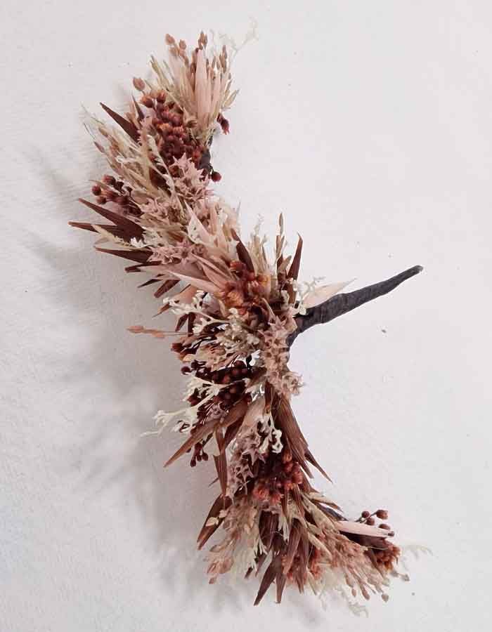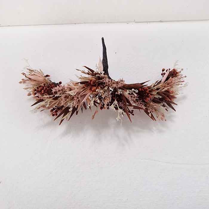Tocado de Mariposa Gaia Marrón y Rosa. Un otoño rosado y cálido en el pelo, adorno de flores con un nuevo diseño que resalta los peinados para novias e invitadas de bodas y comuniones, eventos y celebraciones. ¡¡Si algo diferente para tu pelo, apoyado en tu pelo, que por su forma estilizada, aportándole la sensación de un tocado halado! Accesorio floral para el cabello, una joya hecha con flores preservadas, tocado con forma curva, perfecto para abrazar tu peinado.