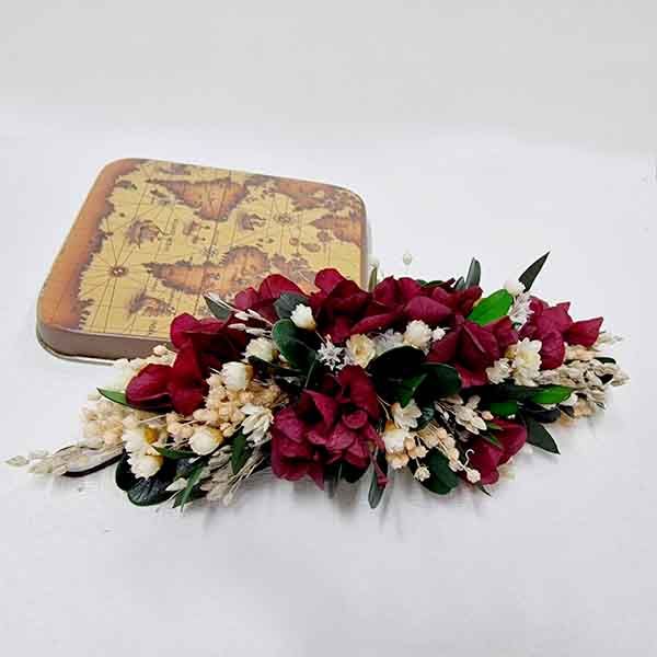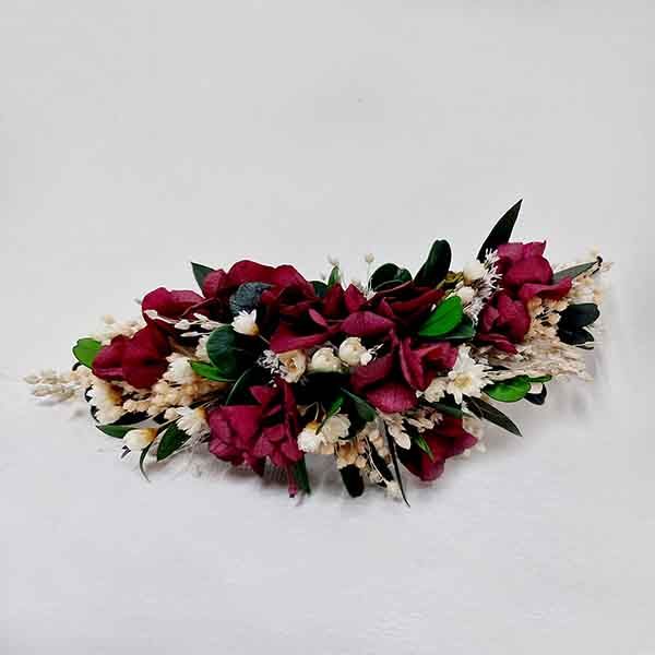 El Tocado Mediano Aura. Que hace que, este tocado sea un básico, un todoterreno parair de boda o celebración, como la invitada y por supuesto es perfecto, si eres la novia, un exuberante tocado perfecto para lograr tu objetivo. ¡¡¡No pasar desapercibida!!! Tocado dónde el blanco roto de la paniculata destaca al burdeos de lahortensia y al verde oscuro del eucaliptus preservado.