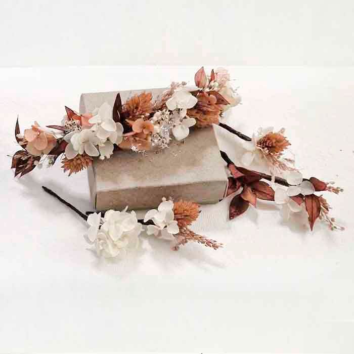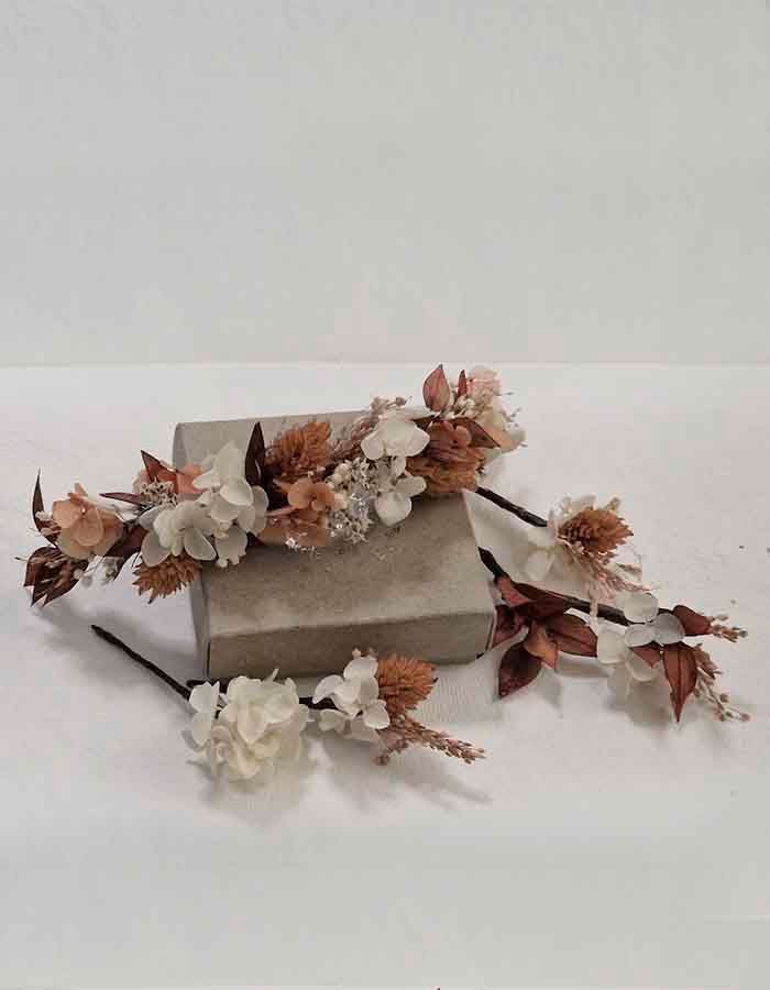 Los colores de la corona o tocado los proporciona la flor de lino blanco roto, bromus natural, brisa mínima blanca, poa color camel, galcerán blanco y café, hortensia cava preservada, corona con cinco pins perfectos para colocar a un peinado de diseño y lucir las flores de tu tocado. Como ya sabes puede pedirnos el ramo y todos los complementos que necesites para tu boda.