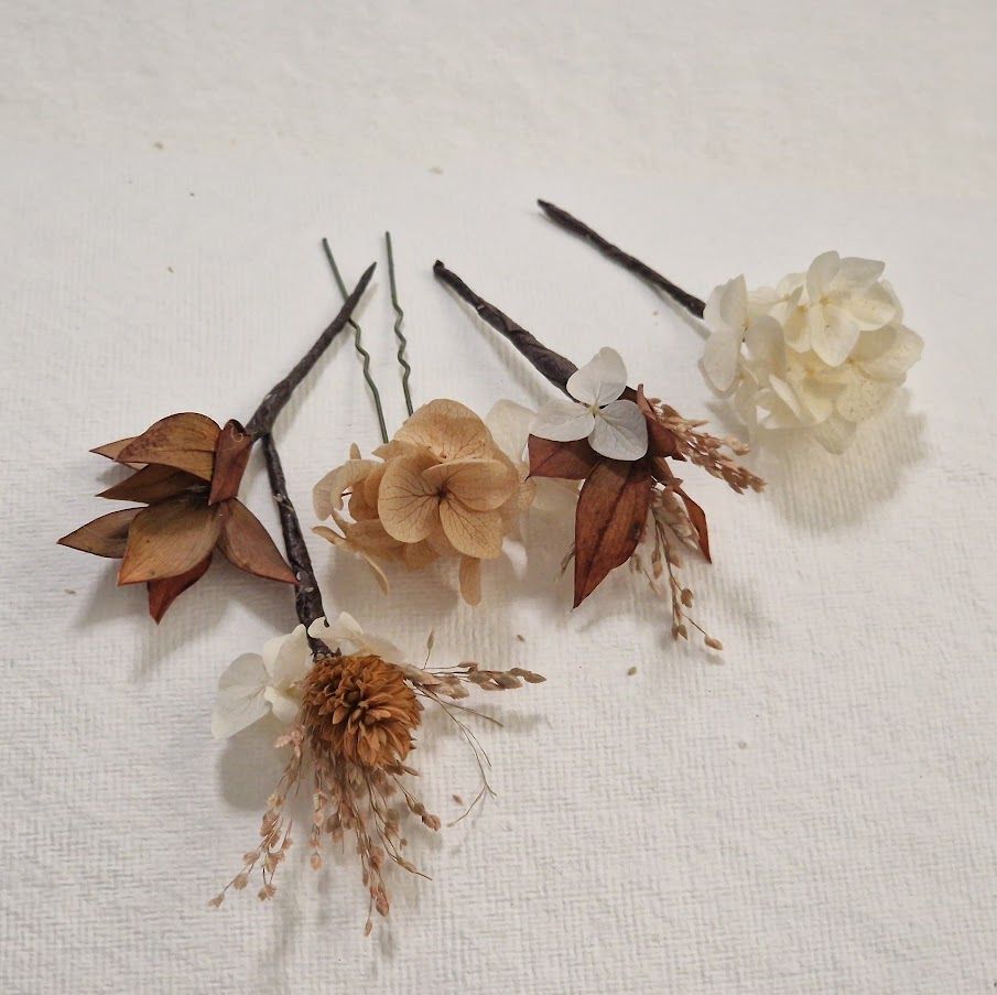 Tocado y Cinco Flores en Cascada Camel. Corona con 5 pins de flores a conjunto para distribuir en forma de cascada floral según convenga en tu peinado. El color marrón, camel, beige, café, son colores cálidos y nos encantan, por eso hemos hecho este tocado tamaño mediano porque con los tres pins puedes completar para que tu peinado perfecto para tu boda, o la boda de tu amiga. El color tostado o camel del tocado otoñal realzará tu peinado sea cual sea la posición. También queda precioso en la parte posterior de tu cabello.