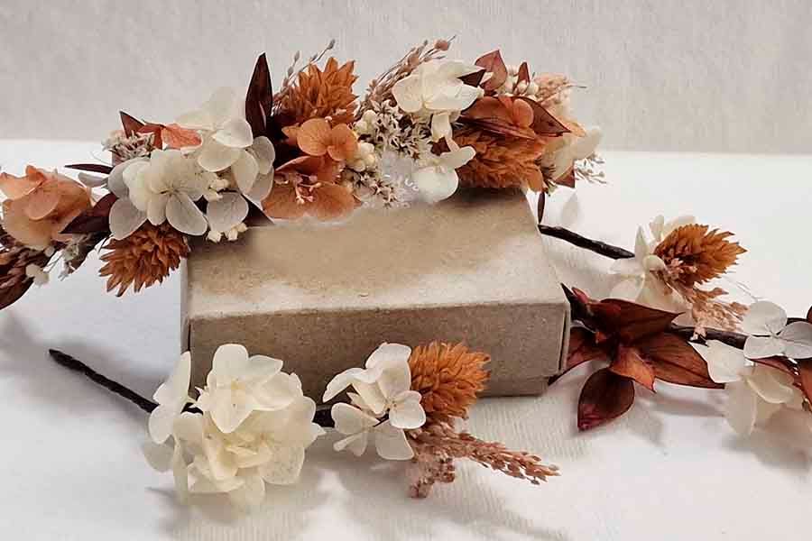En Abril Dissenys nos encanta trabajar con flores y manos, y nos enorgullece presumir de hacer auténticas joyas con ellas, además disponemos de todos los complementos que puedas necesitar, como pulseras, collares, porta alianzas, diademas para niñas ramos para las damas de honor y los detalles de vuestra boda, todo a conjunto para potenciar los colores otoñales en un ambiente totalmente coordinado.