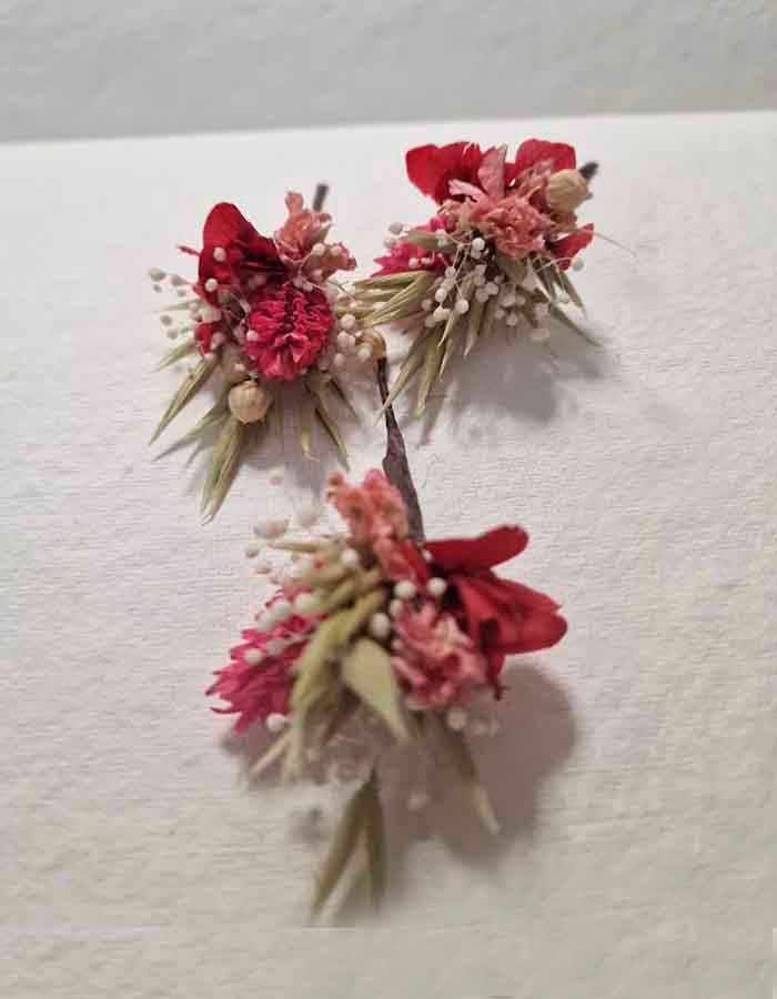 set de tres unidades de brotes de pequeñas flores preservadas para tu pelo pueda presumir y un tocado de flor natural será genial Set de tres unidades de pequeñas flores preservadas para llevar en el pelo, quizás a conjunto con tu vestido o el ramo y los