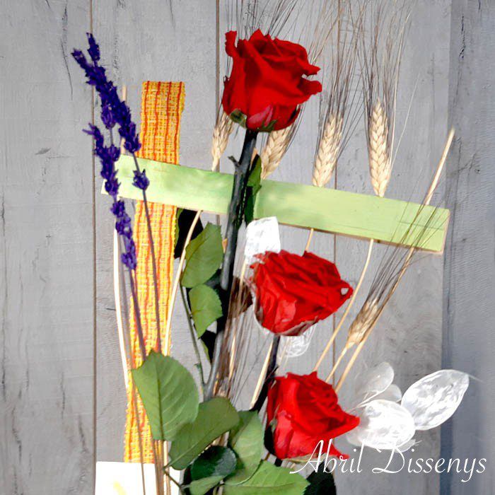 - Flores: Tres rosas, trigo y flores de plata y de lavanda.