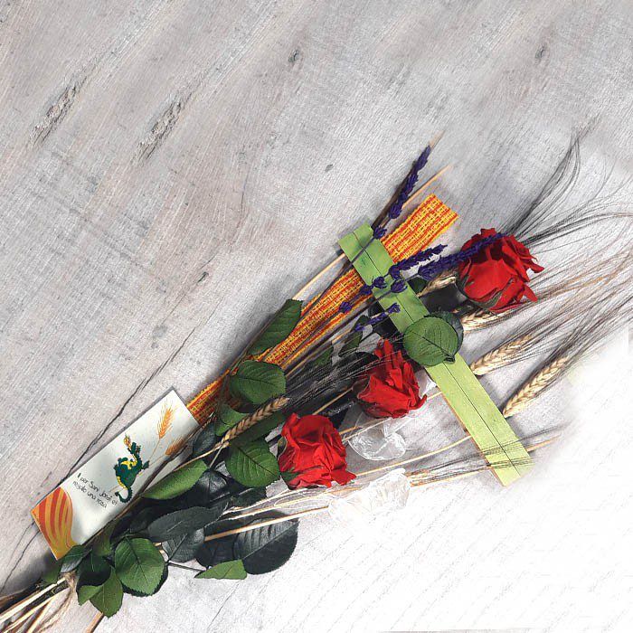 cuatro espigas de trigo y flores de plata y de lavanda preservada. Sobre una estructura de mimbre y trigo, láminas de madera que le aportan belleza y protección a la preciosa rosa acompañada del trigo que aporta el contraste de los colores y los aromas naturales del campo.