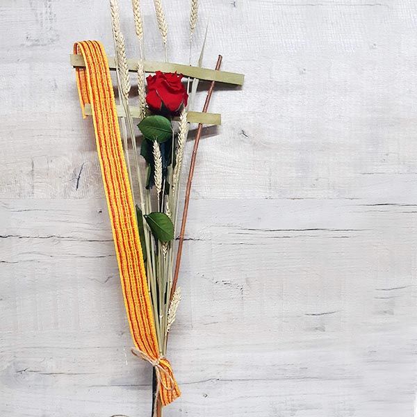 Una rosa roja y Cuatro Barras. La rosa resalta sobre las cuatro barras de la senyera Catalana representadas por cuatro espigas de trigo. Flor preservada. Sobre una estructura de mimbre y trigo, láminas de madera que le aportan belleza y protección a la preciosa rosa acompañada del trigo que aporta el contraste de los colores y los aromas naturales del campo.